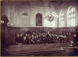 In the rear part of the building a kind of extension was situated where there is an elegant trial room. This two-storey (9m high), large (15 m by 9.5 m) room is embellished with arcaded windows on one of the longer walls and blind arches in rich stucco decoration corresponding to them on the remaining walls. In one of the arcades a portrait of the Emperor Franz Joseph I in coronation costume by the painter Alojzy Schwinger from Graz was placed. The room was covered with an equally rich flattened barrel vault with semicircular lunettes. High panelling, portals, the court podium and benches for the public, rising gradually are undoubtedly the embellishment of the room. The court building was erected by the Eugeniusz Fulda building firm, and both the interior works and the furnishings of the offices were carried out by Viennese and local Cieszyn firms, thus proving their high professionalism. At present in the building there is a District Court of Cieszyn which, on the occasion of its 100th anniversary, carried out an overhaul, restoring the former splendour of the façades and the interiors.