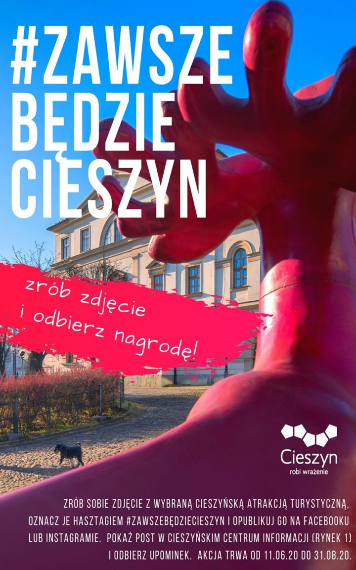 Odwiedź Cieszyn, zrób zdjęcie, oznacz je hasztagiem #zawszebędziecieszyn i opublikuj na Facebooku lub Instagramie. Następnie pokaż post w Cieszyńskim Centrum Informacji (Rynek 1) i odbierz upominek. Liczymy na to, że będziecie się z nami dobrze bawić i długo wspominać, bo wszyscy wiemy, że Cieszyn robi wrażenie. Akcja trwa do 31 sierpnia. Zachęcamy do udziału. WIĘCEJ