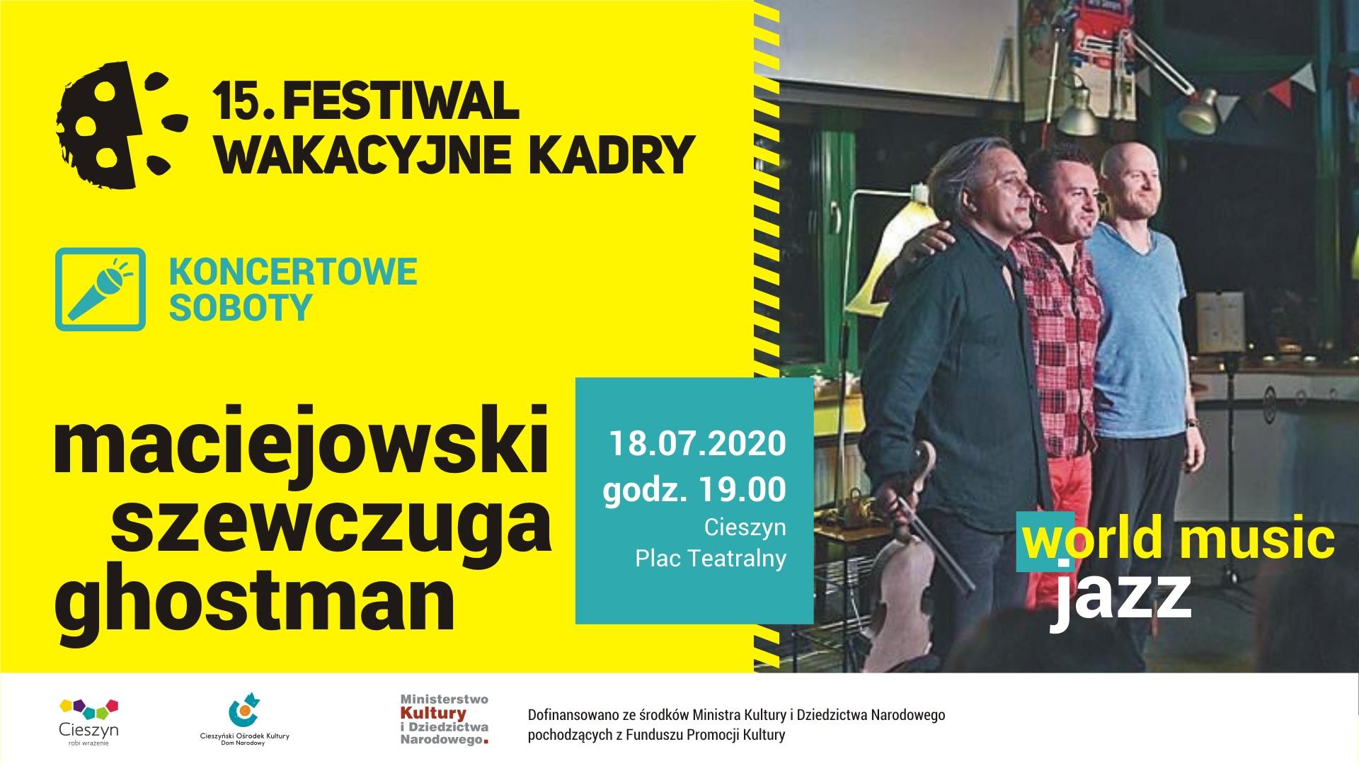W sobotę 18 lipca o godzinie 19.00 na Placu Teatralnym w Cieszynie, w kameralnym, plenerowym koncercie wystąpi dla nas trio MACIEJOWSKI / SZEWCZUGA / GHOSTMAN.