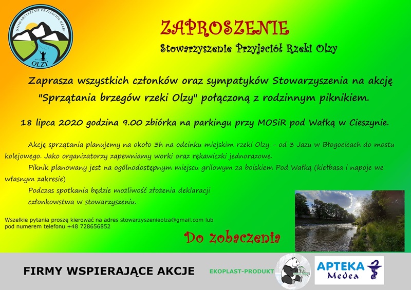 Stowarzyszenie Przyjaciół Rzeki Olzy zaprasza wszystkich członków i sympatyków na akcję „Sprzątania brzegów rzeki Olzy” połączoną z rodzinnym piknikiem. Start: 18 lipca godz. 9.00 zbiórka przy parkingu pod Wałką w Cieszynie. Będziecie? Zapraszamy w imieniu organizatorów. WIĘCEJ