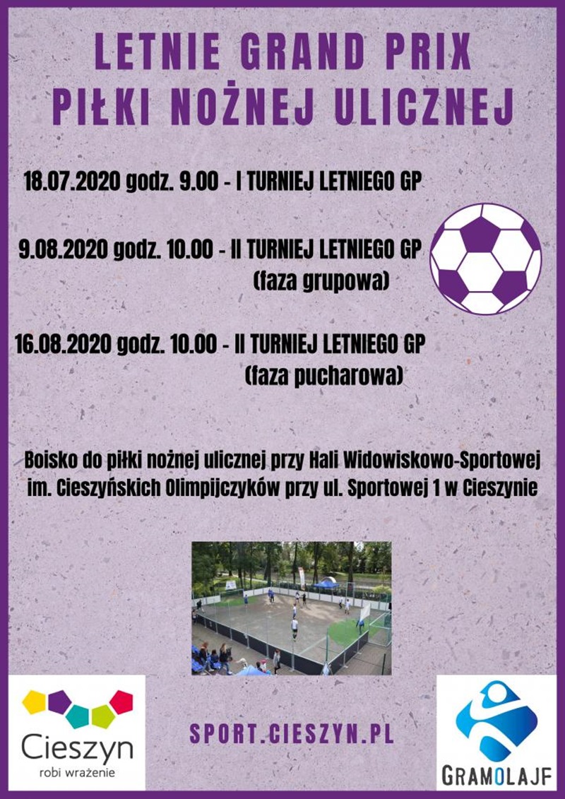 Stowarzyszenie GramOLajf przy współpracy z Miastem Cieszyn organizuje Letnie Grand Prix Piłki Nożnej Ulicznej. Rozgrywki będą składały się z trzech turniejów, a każdy turniej będzie liczył się do klasyfikacji generalnej. Udział w zawodach weźmie 12 drużyn m.in. z Cieszyna, Katowic, Dębowca k. Częstochowy, w tym wicemistrz Polski.