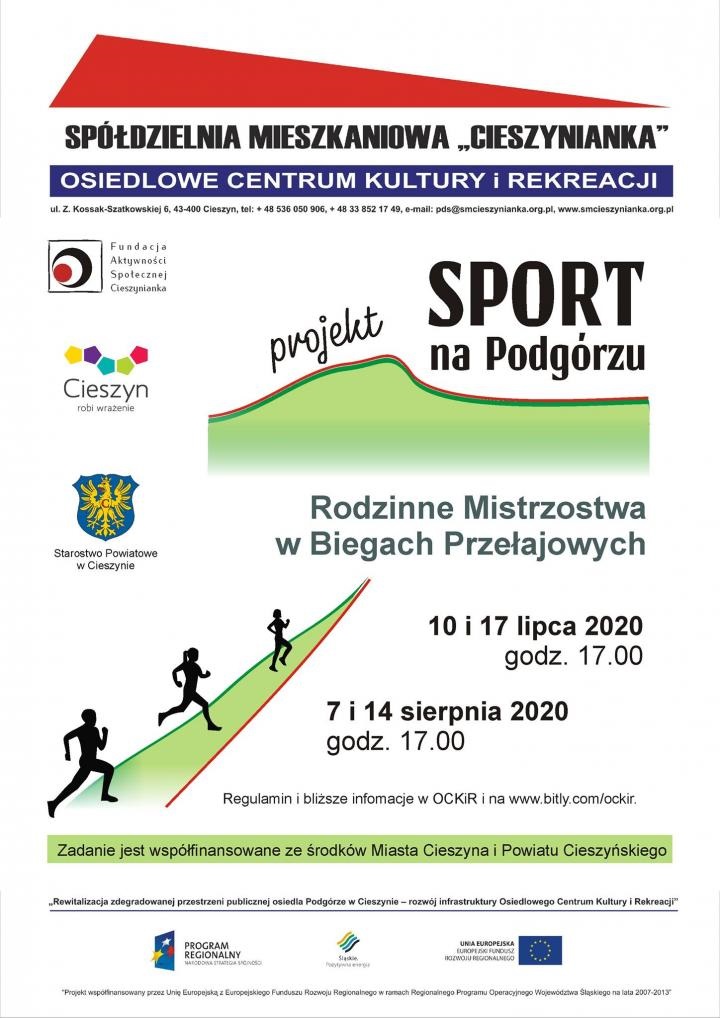 Fundacja Aktywności Społecznej Cieszynianka zaprasza do udziału w Rodzinnych Mistrzostwach w Biegach Przełajowych, które odbędą się na os. Podgórze - okolice "jaru", poniżej ul. Popiołka 4 w dniach 17 lipca oraz 7 i 14 sierpnia o godz. 17.00. Udział w wydarzeniu jest bezpłatny, organizator zapewnia wodę i "zdrowe kalorie", a dla laureatów poszczególnych kategorii - nagrody. W większości kategorii znaczenie ma zbieranie punktów w poszczególnych terminach, jednak jednorazowy start - w kategorii "Najlepszy czas" też będzie premiowany i nagradzany. Zadanie jest współfinansowane ze środków Miasta Cieszyna i Powiatu Cieszyńskiego. WIĘCEJ