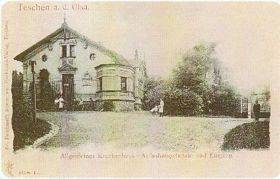 Přijímací kancelář a hlavní vchod do Slezské nemocnice z Bielské ulice. Objekt byl postaven v r. 1888 jako první z budov budoucí nemocnice. Bylo zde také ambulatorium.