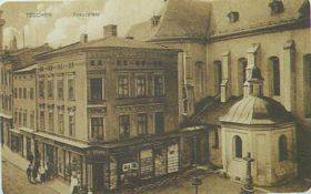 Náměstí Sv Kříže. Vpraro je kaple Sv. Kříže při farním kostele, kterou dal postavit v r. 1660 hrabě Johann Friedrich Larisch, před ní stojí kamenný křiž se soškou Panny Marie Bolestné z r. 1764. Vedle je knihkupectví Sigmnuda Stukse (od r.1889), kde se prodávala beletrie a turistické průvodce.