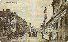 Prutkova ulice, pohled od evangelického kostela. Vpravo je hostinec „ U Zlatého slunce" („Zuř goldenen Sonne"), před kterým končila dráha těšínské tramvaje. Ulice byla pojmenována na počest P. Jerzyho Prutka, katechety známého svou dobročinností, který se ke konci svého života dostal do konfliktu se svými církevními nadřízenými.