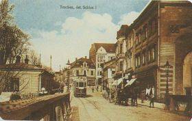 Der Blick auf die Schloßgasse von der Olsabrücke aus. Die Straßenbahn, wenn sie in die Kronprinzessin-Stephanie-Straße (jetzt ul. Głęboka) abbog, fuhr an einem Eckhaus vorbei, in dem sich ein Restaurant befand, dessen Besitzer Rudolf Buchta jun. hieß.