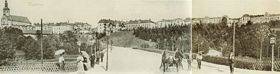 Die Franz-Josef-I.-Straße von der Brücke aus gesehen. Unter der Straße fließt ein künstlicher Kanal, der sogenannte Mühlgraben. Auf der linken Seite des Bildes sieht man auf einem Hügel u. a. die evangelische Kirche, das städtische Waisenhaus, die Landwehrkaserne und die Infanteriekaserne.