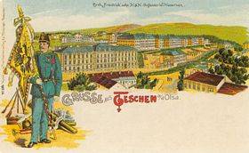 Der Gesamtblick auf die Infanteriekaserne in der Erzherzog-Eugen- und der Garnisonstraße (jetzt ul. Sikorskiego). Die Kaserne wurde 1896 in Betrieb genommen. Zu Ehren des Besitzers des Teschener Herzogtums und des Oberbefehlshabers des österreichischen Heeres wurde sie Erzherzog-Friedrich-Kaserne genannt.