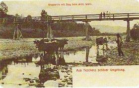 In der Nähe des dritten Wehrs gab es auch eine Holzbrücke über die Olsa. Wie man auf dem Foto sieht, war es nicht immer notwendig, von dieser Brücke Gebrauch zu machen. In der Zeit zwischen den Weltkriegen war die Brücke für den lokalen Grenzverkehr bestimmt.