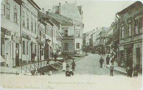 Der Blick auf die Kronprinzessin-Stefanie-Straße von der Schloßgasse aus. In der Kronprinzessin-Stephanie-Straße hatten immer viele bekannte Teschener Geschäfte und Firmen ihren Sitz. Rechts sieht man die Gemischtwarenhandlung von Max Mandl, links befanden sich die Apotheke „Zum Engel", das Lederwarengeschäft von Emmerich Scholtis und das Fotoatelier von Heinrich Jandaurek.