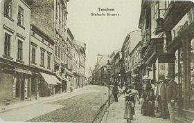 Der Blick auf einen Abschnitt der Kronprinzessin-Stefanie-Straße, der in der Nähe der Kreuzung Münzgasse lag. Hier gab es überwiegend Textilgeschäfte, von denen die bekanntesten der Familie Lewiński gehörten. Rechts befanden sich das Juweliergeschäft und die Uhrmacherwerkstatt von Anton Wybranietz. Im Hintergrund sieht man „Das Deutsche Haus" mit seiner Zwiebelkuppel sowie den Rathausturm.
