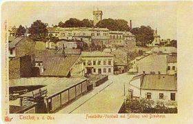 Der untere Abschnitt der Lastenstraße mit der Aussicht aufs Schloß und die Schloßbrauerei. Links sieht man die Möbelfabrik Johann Skřivaneks. Sie entwickelte sich aus einer Schreinerwerkstatt, die in den Jahren 1880-1893 an dieser Stelle in Betrieb war. Die Fabrik ging 1911 in die Hände Skřivaneks Sohnes Emil über. Auf der linken Seite liegt hinter der Fabrik die Schloßgasse (heute ul. Zamkowa), an deren Ende sich das Freistädter Tor befand. Das Tor wurde Ende des 18.Jh.s wegen Baufälligkeit abgerissen.