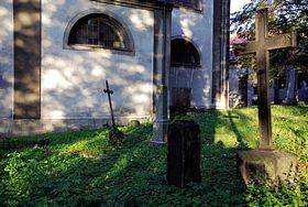 Der jetzige Park mit alten Bäumen, hinter denen sich die Südfassade der Kirche verbirgt, war einmal ein evangelischer Friedhof. Der Friedhof entstand 1709 zusammen mit der Kirche, wurde dann Mitte des 19. Jahrhunderts neu angelegt und diente noch bis zum Jahre 1938 als Begräbnisstätte. Ende der sechziger Jahre des 20. Jahrhunderts war der Großteil des Friedhofs durch die Stadt übernommen und sogleich in einen Park umgewandelt worden. Nur in unmittelbarer Nähe der Kirche waren einige wenige, aus dem 19. Jahrhundert stammende und heute verwitterte, Grabsteine übrig geblieben.