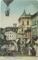 Die Kronprinzessin-Stefanie-Straße mit dem Jagdschloß und dem Piastenturm im Hintergrund. In dem Eckgebäude Münzgasse, das im Jahre 1897 von Wilhelm Berger erbaut wurde, befand sich der „Mode-Bazar" von Leon Sonnenschein. Die Abbildung des über der Stadt schwebenden Luftballons sowie der vielen Fußgänger sollte den Eindruck einer Großstadt vermitteln.