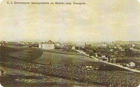 Blick auf das Bobertal und das Dorf Bobrek von einem Abhang, dem sogenannten Banoterberg. Man sieht hier das Gebäude des polnischen Lehrerseminars und auf der rechten Seite die Bielitzer Straße. Sie verband vom Mittelalter an Teschen mit Skotschau, Bielitz und Kleinpolen. Von der zweiten Hälfte des 18. Jh.s an stellte sie einen Abschnitt der sog. Kaiserstraße dar, die von Wien nach Lemberg führte.