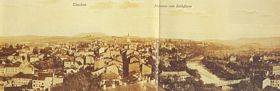 Die Stadtansicht mit dem Panorama der Beskiden im Hintergrund zeigt hier den Westteil der Stadt, den sogenannten Sachsenberg. Das neue Gebäude des Deutschen Theaters, das an der Stelle der alten Kaserne entstanden war, ist auf diesem Foto bereits zu sehen. (um 1915)