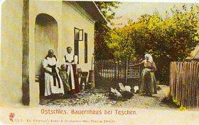 Der Hof eines Bauernhauses aus der Umgebung von Teschen, höchstwahrscheinlich aus Bobrek. Fotografiert wurden hier Frauen in Teschener Volkstrachten. An der Hauswand liegen Geräte, die in einer Bauernwirtschaft gebraucht wurden, unter anderem eine Buttermaschine.