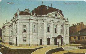 Das Gebäude des Deutschen Theaters auf dem Kasernenplatz. Der im Jahre 1902 gegründete Teschener Theaterbauverein ließ in den Jahren 1908-1910 an der Stelle der ehemaligen Kaserne ein Theater errichten. Die Pläne dafür lieferten die Wiener Architekten Ferdinand Fellner und Hermann Helmer. Heute heißt es Adam-Mickiewicz-Theater.