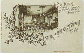Das Lokal des Teschener Männergesangvereins im „Deutschen Haus". Der nach der Schützengesellschaft älteste Teschener Verein wurde im Jahre 1841 gegründet, und seine Tätigkeit dauerte über das Jahr 1920 hinaus. Der Verein gab zahlreiche Konzerte und Auftritte und trug damit maßgeblich zur Belebung des Musiklebens in der Stadt und ihrer Umgebung.