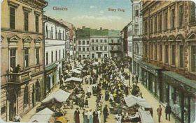 Blick auf den Alten Markt in Richtung Münzgasse an einem Markttag. Teschen erhielt bereits im Mittelalter das Recht, zweimal im Jahr einen Jahrmarkt zu veranstalten. Ende des 17. Jh.s fanden schon fünf Jahrmärkte jährlich statt, und vom 19. Jh. an gab es an jedem ersten Montag des Monats einen.