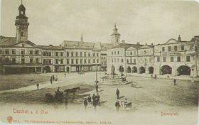 Die südwestliche Ecke des Demelplatzes. Im Westen grenzten einige Krämerläden und die ehemalige Stadtwache an das Rathaus an. Diese Gebäude hatte 1869 Baumeister Gottfried Dittrich um eine Ebene aufgestockt, und man hatte auch damals die gesamte Fassade im Stil der Neorenaissance umgestaltet. Bis 1906 hatte in diesem Gebäude das Teschener Kreisgericht seinen Sitz.
