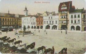 Die westliche Seite des Demelplatzes. Im Haus Nr. 6 führte Dr. Karl Zaar eine der ersten Apotheken in der Stadt. Sie befand sich früher im Haus Nr. 8 und hieß „Apotheke zum Schwarzen Hund". Zwischen diesen zwei Häusern ließ August Eduard Schröder, ein Gelehrter und Wirtschaftswissenschaftler, im Jahre 1911 ein dreistöckiges Stadthaus bauen. Auf der anderen Seite des Marktplatzes gab es einen Droschkenstand. In Teschen standen zu dieser Zeit den Einwohnern und Besuchern ungefähr 30 Pferdedroschken zur Verfügung.