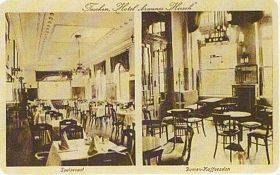 Das Hotel „Zum Braunen Hirschen" von innen: hier der Speisesaal und das Damencafé. Das Hotel verfügte über 67 Zimmer und war zeitgemäß und wirtschaftlich organisiert. Der Ausstattung und Einrichtung standen Wiener Vorbilder Pate. Zu Konzertauftritten auf der hoteleigenen Bühne wurden Künstler, hauptsächlich aus Wien, eingeladen.
