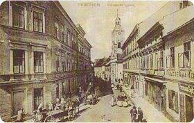 Die Scherschnikgasse. Blick vom Oberring in Richtung der Kreuzkirche. Auf der linken Seite des Bildes sieht man zuerst die Gaststätte „Zum Goldenen Ochsen“ und dann das Hotel von Franz Piller namens „Schlesisches Haus“. Das Hotel warb mit elegant eingerichteten Speisesälen, elektrischer Lüftung, preiswerten Zimmern und gutbürgerlicher Küche um Gäste. Auf der rechten Seite der Straße sieht man das Lederfachgeschäft von Hermann Spitzer.