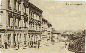 Die Berggasse. Links im Bild sieht man Stadthäuser aus dem 19. Jh. Auf der gegenüberliegenden Straßenseite befand sich ein Viehmarkt, den man auch Schweinemarkt nannte, sowie Baracken des städtischen Armenhauses.