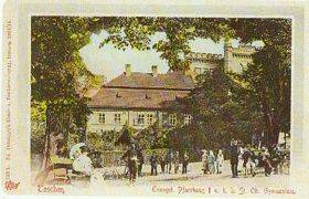Der Kirchenplatz (heute plac Kościelny) mit dem evangelischen Pfarrhaus und dem kaiserlich-königlichen Staatsobergymnasium. Bereits im 18. Jh. waren bei der evangelischen Kirche verschiedene Gebäude für die Teschener evangelische Kirchengemeinde entstanden. Auch das Pfarrhaus mit einem Mansardendach gehörte dazu. 1869 wurde das neugotische Gebäude des evangelischen Gymnasiums erbaut, aber schon 1873 mit dem katholischen Gymnasium zu einem staatlichem Obergymnasium zusammengelegt.