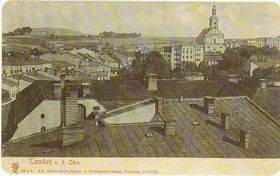 Blick vom Rathausturm auf das Panorama des Südostteils der Stadt. Im Vordergrund sieht man die Dächer des Stadthauses in der Silbergasse und die des Larisch-Schlosses (des heutigen Museums), auf der linken Seite dann die Häuser in der Prutekgasse, unterhalb der evangelischen Kirche die Rückseite des staatlichen Obergymnasiums (der heutigen Grundschule der Evangelischen Gesellschaft.) und weiter rechts die Gebäude der Kasernenanlage.