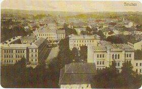 Das Teschener Panorama vom Turm der evangelischen Kirche aus gesehen. Auf der linken Seite ist das Gebäude der Volks- und Bürgerschule (heute der Grundschule und der Nikolaus-Kopernikus-Oberschule) sichtbar und dahinter das Erzherzogliche Albrechtsgymnasium (heute: die Antoni-Osuchowski-Oberschule). In der Mitte sieht man das evangelische Pfarrhaus, rechts von ihm das ehemalige Gymnasium und dahinter die Rückseite des evangelischen Mädcheninternats.