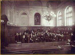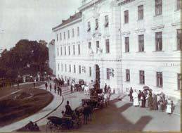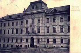 Mit dem Aufenthalt Franz Josefs I. in Teschen ist auch das ansehnliche Gebäude des Amtsgerichts (früher des Kreisgerichts) verbunden. Der Kaiser besuchte das Gebäude persönlich am 2. September 1906 und hatte zum Andenken eine Eiche davor gepflanzt, die man die “Kaisereiche” nennt. Das Gerichtsgebäude war ganz neu, da man es offiziell am 2. Dezember 1905 eröffnet hatte, also am 57. Jahrestag der Thronbesteigung des Kaisers. Den Beschluß, ein neues Gerichtsgebäude zu errichten, hatte man schon früher gefaßt, da die bisherigen Räumlichkeiten des Kreisgerichts beim Rathaus am Teschener Marktplatz zu klein geworden waren. Die Stadtverwaltung beanspruchte ebenfalls weitere Räume und wollte an Stelle des Gerichts einen neuen Sitzungssaal für den Stadtrat bauen lassen. Im Jahre 1901 hatte sich der Präsident des Kreisgerichts, der kaiserlich-königliche Hofrat Emanuel Harbich, an den Baurat des Innenministerium in Wien Rudolf Lang und an den bekannten Teschener Architekten Eugen Fulda gewandt und sie beauftragt, die Pläne für das neue Gebäude anzufertigen. Es sollte in der Töpfergasse vor dem bereits vorhandenen Gefängnis stehen, so daß beide Gebäude aneinander stießen. Lang und Fulda hatten die Pläne für ein imposantes Gebäude entworfen. Sein Grundriß war beinahe quadratisch - die Abmessungen betrugen 58 mal 55 Meter, und in der Mitte der bebauten Fläche lag ein Innenhof. Die Hauptfassade erhielt eine Dekoration im Stil des Neobarock, die aus einem mit Streifen rustizierten Sockel und aus Fenstern mit einem massiven Schlußstein bestand. Die Fenster des ersten und zweiten Stockwerks, von senkrechten rustizierten Mauerstreifen (Lisenen) eingefaßt, hatten Stürze mit Schlußsteinen erhalten. Dies hatte dem Gebäude ein schweres und solides Aussehen verliehen. Die Hauptdekoration der Fassade ist der Dreiachsenrisalit mit einem Eingangstor, das ein Liktorenbündel mit Beil - Symbol der Gerechtigkeit - im Schlußstein hat. In dem gesprengten Segmentgiebel sitzen Putten, die die anderen Attribute der Gerechtigkeit halten: eine Waage und einen Schwert. Über einem Fenster im zweiten Stockwerk befand sich ursprünglich der kaiserliche Doppeladler und die Aufschrift “K. K. Kreisgericht”. Das Gebäude erhielt ein Satteldach aus Blech mit Dachfenstern, und der Mittelrisalit wurde durch ein Mansardendach unterstrichen.