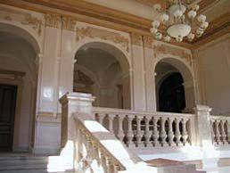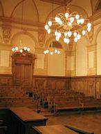 Imposant und majestätisch sehen auch die Eingangshalle und das Treppenhaus aus. Das Treppenhaus mit dreiläufiger Treppe ist mit klassizistischen Arkaden, Marmorsäulen und Geländerpfosten geschmückt. Dieser repräsentative Eingang betont die Bestimmung des Gebäudes und die Majestät des Gesetzes. Als erstes sieht der Ankommende die übernatürlich große Figur der “Justitia” aus weißem Carrara-Marmor. Die Figur stellt die Göttin der Gerechtigkeit Themis mit einem Schwert und einem geöffneten Buch dar. Das Gesicht der Göttin mit den verbundenen Augen, dem Symbol der “blinden Gerechtigkeit”, ist auch im Halbdunkel sichtbar, weil darauf Licht durch einen geschickt plazierten Spiegel fällt. Diese Skulptur, ähnlich wie die der Putte, hatte der Wiener Bildhauer Ernest Hegenbarth gemeißelt. Er ist unter anderem durch die Fassadendekorationen des Theaters an der Wien und des Volkstheaters in Wien bekannt. Auf der rechten Seite der Eingangshalle wurde eine Gedenktafel aus grünem schwedischem Marmor aufgehängt, auf der folgende Inschrift in deutscher Sprache zu lesen ist: “Erbaut unter der Regierung Seiner Majestät des Kaisers Franz Joseph I. 1903-1905.” Heute an Stelle dieser Tafel befindet sich eine aus dem Jahre 1928, die Dr. Felix Bocheński gewidmet ist. Dr. Bocheński war der Organisator des polnischen Gerichtswesens in Schlesien und der erste polnische Präsident des Kreisgerichts in Teschen. In dem hinteren Teil des Gebäudes hatte man eine Art Pavillon gebaut, wo sich ein repräsentativer Gerichtssaal befindet. Dieser Raum ist zwei Stockwerke (9 Meter) hoch, hat die Maße 15 mal 9,5 Meter und wurde mit Arkadenfenstern auf einer der längeren Wände und mit blinden Arkaden auf den übrigen Wänden geschmückt. In einer der Arkaden hing ein Porträt Kaiser Franz Josefs I. im Krönungsornat, das von dem Maler Alois Schwinger aus Graz geschaffen wurde. Der Saal wird zusätzlich durch die Innenausstattung geschmückt. Sie besteht aus einer hohen Holzvertäfelung, Portalen, dem Richtertisch, und den stufenförmig angelegten Sitzplätzen für das Publikum. Das Gerichtsgebäude wurde von der Baufirma Eugen Fuldas gebaut, und der Innenausbau und die Ausstattung der Büroräume führten Wiener sowie Teschener Firmen aus, wodurch die hohen Qualifikationen der ortsansässigen Firmen bewiesen wurden. Heute hat in diesem Gebäude das Amtsgericht seinen Sitz. Anläßlich des hundertjährigen Bestehens des Objektes hat das Amtsgericht eine Generalrenovierung durchführen lassen. Dadurch haben sowohl die Fassade als auch die Innenräume den alten Glanz zurückerhalten.