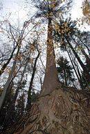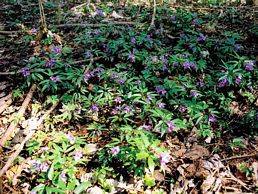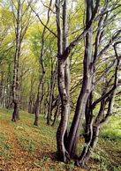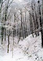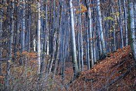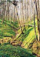 Wir sind wieder am Eingang zur Schlucht und betreten jetzt einen Pfad, der auf einem hohen und steilen Abhang verläuft. Auf dem Abhang wachsen hauptsächlich Buchen und Hainbuchen. In der Bodenschicht findet man im Frühjahr das weißblühende Buschwindröschen und das unscheinbare, grünlich blühende Waldbingelkraut sowie ab und zu auch die weißen nickenden Köpfchen des Schneeglöckchens. Zu einem späteren Zeitpunkt breitet sich der Bärlauch in der Bodenschicht aus. An etwas feuchteren Stellen, zum Beispiel an dem kleinen Bach und an den Hängen der Schlucht, erscheinen im Frühjahr die gelben Blüten des Scharbockskrautes. Zur gleichen Zeit entwickeln sich auch die Triebe der Vielblütigen Weißwurz. Schon am Waldrand, sogar direkt an dem Pfad, sieht man die gelbgrünen Blütenbüschel der Grünen Schaftdolde. Wir sollten hier auch auf die großen pfeilgeraden Buchen mit der glatten silbriggrauen Rinde aufmerksam werden. Die Buchen tragen alle paar Jahre reichlich Früchte. Der vierlappige Fruchtbecher, der mit weichen Dornen bedeckt ist, trocknet im Herbst aus, und es fallen zwei dreikantige Nüsse heraus, die man Bucheckern nennt. Im Frühjahr wachsen daraus kleine Sämlinge, die nierenförmige große Keimblätter haben. Die Buchen sehen besonders schön im Frühjahr aus, wenn ihre Blätter hellgrün sind und feine weiße Härchen am Rand haben, sowie im Herbst, wenn die Blätter zuerst gelb, dann orangefarben, rötlich und schließlich braun werden. Am Rande der Schlucht unter den Buchen treffen wir zu Beginn des Frühlings ganze Felder der purpurn-violett blühenden Drüsenzahnwurz an. Die Drüsenzahnwurz ist charakteristisch für die Pflanzengemeinschaft der Karpatischen Buchenwälder. In diesem Naturschutzgebiet wächst sie hauptsächlich auf den schattigen Hängen der Schlucht. In dem Baumbestand kommen außerdem vor: der Bergahorn, die Winterlinde und die Gemeine Esche. Im Frühling blüht in der Bodenschicht die Frühlingsplatterbse und der Gefingerte Lerchensporn sowie die zu einem etwas späteren Zeitpunkt blühende und unter Naturschutz stehende Gewöhnliche Haselwurz. Im Spätfrühling vernehmen wir im Wald einen intensiven Geruch. Da steht jetzt der Bärlauch in voller Blüte und bedeckt feldermäßig die Hänge der Schlucht und die feuchteren Stellen des Schluchtkamms. Entlang des Weges wächst auch der Giersch und der Taumelkälberkropf. Im Sommer werden sie dann die vorherrschenden Pflanzen in der Bodenschicht sein. Der Pfad verläßt jetzt den Schluchthang, biegt leicht nach Südosten ab und verläuft ab dann durch ein flaches Gelände.