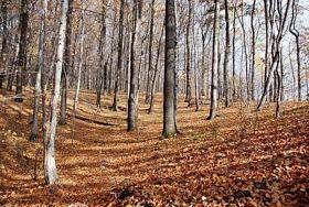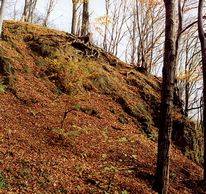 Die Informationstafel macht uns mit den Hauptdaten des Naturschutzgebietes bekannt, unterrichtet über seine Bedeutung vom Gesichtspunkt der Natur und der Landschaft und klärt über die Verbote auf, die zu beachten sind. „Die Hügel“ - mit der Fläche von 14,77 Hektaren - wurden durch einen Erlaß des Ministers für Forsten am 18. Dezember 1953 zum Naturschutzgebiet erklärt, „damit aus wissenschaftlichen und didaktischen Gründen ein Fragment des Mischwaldes mit der Linde und mit seltenen Pflanzen in der Bodenschicht erhalten bleibt. Den wissenschaftlichen Wert dieses Naturdenkmals steigert zusätzlich das Vorkommen der Schichten von Magmagestein, Teschenit genannt, in seinem Gebiet“. Der Weg, den wir jetzt betreten, gehört zu einem der Teschener Spazierwege - dem „Stadtrandweg“ - und ist rot gekennzeichnet. Unseren Spaziergang durch diesen Abschnitt der Via Natura beginnen wir am Fuße eines ziemlich steilen Abhangs neben dem Ausgang einer Schlucht, auf deren Boden ein kleiner Bach fließt, der zeitweise austrocknet. Man sollte der Form der Schlucht oder des Baches etwas Aufmerksamkeit schenken. Ihr Längsschnitt erinnert an den Buchstaben „V“, die Hänge sind steil und auf ihrem Boden liegen viele, häufig bereits verrottende Stämme, Äste und Baumzweige. Die Schlucht durchschneidet das Naturschutzgebiet in Querrichtung, hat die Länge von ungefähr 500 Metern und zusammen mit zwei kürzeren Zuflüssen schneidet sich in den Boden bis zu einer Tiefe von bis 10-15 Meter ein.