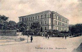 Das Gebäude der heutigen Grund- und Hauptschule Nr. 4 und der Nikolaus-Kopernikus-Oberschule (des Allgemeinbildenden Lyzeums) hatten die Teschener Stadtträger im Jahre 1879 im Stil der Neorenaissance erbauen lassen. Es diente als städtische Bürgerschule für Jungen und Mädchen. Im Jahre 1875 hatte der Stadtrat den Wettbewerb für ein Projekt der neuen Schule ausgeschrieben und beauftragte den Österreichischen Ingenieur- und Architekten Verein damit, den Gewinner zu ermitteln. Der Wettbewerb erregte lebhaftes Interesse bei den Architekten der gesamten Monarchie. Es waren sechsundfünfzig Entwürfe eingegangen, und bereits im März 1876 hatte die Jury unter dem Vorsitz Heinrich von Ferstels, des Schöpfers der Votivkirche und der Universität in Wien, seine Entscheidung getroffen. Den Preis gewann der Entwurf, der in dem Wiener Architektenbüro von Fellner und Hödel ausgearbeitet worden war. Mit dem vom städtischen Baumeister Alois Jedeck geleiteten Bau wurde dann im April 1877 begonnen. Zwei Jahre später war die Schule fertig. Sie wurde auf einem leeren Grundstück gebaut, das sich an der Ecke Kronprinz-Rudolf- Platz und Kaiserin-Elisabeth-Straße (heute Plac Wolności und ul. Stalmacha) befand. Das Gebäude hat die Form eines geschlossenen Vierecks mit den Maßen 50 mal 42 Meter mit einem Innenhof in der Mitte. Der gleichmäßige Körper hatte eine Außendekoration im Stil der Neorenaissance erhalten. Die Harmonie der Komposition wurde durch die gleich hohen Stockwerke und die rhythmisch angeordneten Fenster mit ihrer Teilung durch Balkenwerk und Wandpfeiler hervorgerufen. Die Hauptfassade wurde durch das zentral liegende Einfahrtstor und die symmetrisch angeordneten Seitenrisalite hervorgehoben. Einige von den Repräsentationsräumen der Schule, wie zum Beispiel die Eingangshallen und der Versammlungs- und Veranstaltungssaal, hatten ebenfalls eine Ausstattung im Stil der Neorenaissance erhalten. Die feierliche Eröffnung der Schule fand am 13. September 1879 statt. Eigens zu diesem Anlaß war aus Wien der Minister für Kultus und Unterricht Karl von Stremayer gekommen. Es wurde damals eine Gedenktafel enthüllt, die sich bis heute in der Eingangshalle der Schule befindet. Die Tafel ist aus weißem Marmor, und die Inschrift in deutscher Sprache lautet: “Der Bau dieser Volkschule wurde unter der Regierung Sr. Majestät des Kaisers Franz Josef I. von der Stadtgemeinde Teschen nach dem Preisgekrönten Entwurfe der Wiener Architekten Fellner und Hödl am 12. April 1877 begonnen und am 31. Juli 1879 vollendet. Die Eröffnung des Unterrichtes in diesem Volksschulgebäude erfolgte am 15. September 1879. Die göttliche Vorsehung walte über demselben. Ausgeführt wurde dieser Bau unter der Leitung der Stadtingenieure Carl Khünl vom 1. Mai 1877 bis 15. Jänner 1879 und Architekt Carl Stadler von Wolffersgrün vom 16. Jänner 1879 bis 31. Juli 1879 durch den Stadt-Baumeister Alois Jedeck.”