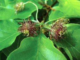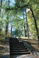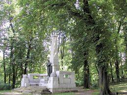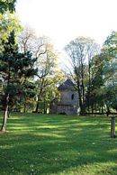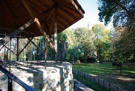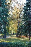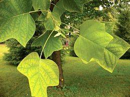- der Amerikanische Tulpenbaum - auch ein Naturdenkmal (187cm / 20m) - ist der einzige Baum dieser Art in dem Park. Er wächst auf halbem Wege zu der Aussichtsterrasse, oberhalb der obenerwähnten Hainbuche. Der Tulpenbaum hat sehr charakteristische Blätter, deren Form mit vier gespitzten Lappen und gestutzter Spitze ziemlich ungewöhnlich ist. Die Blätter mit 20 Zentimeter langen Stielen färben sich im Herbst goldgelb oder orange. Die Blüten dieses Baumes befinden sich einzeln am Ende der Seitentriebe, und ihre Form erinnert an eine Tulpe. Im Inneren sind die Blüten gelblichgrün (VI-VII) und von außen grünlich, so daß sie sich nicht deutlich von den Blättern unterscheiden. Diese Baumart stammt aus den Ostregionen Nordamerikas;