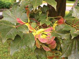 - der Hellrote Spitzahorn ‘Schwedleri’. Es ist ein junger Baum (119cm / 9m), dessen Blätter sich im Frühjahr knallrot färben. Er wächst an der Mauer, die den Park von der Limanowski-Straße trennt. Von der Straße ist er auch am besten sichtbar. Die anderen in seiner Nachbarschaft wachsenden Bäume behindern sein Wachstum, so daß die Krone des Spitzahorns teilweise verunstaltet ist. Unter anderem durch