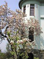Im Friedenspark in der Nähe der Orchesterbühne wachsen auch zwei schöne Sträucher der Tulpenmagnolie ‘Alexandrina’ mit großen auffallenden Blüten. Die Blütenblätter sind außen zartrosa, zum Blütenansatz hin dunkler, nämlich purpurrosa, und mit schwachen Streifen versehen. Gleich nebenan wächst ein Strauch der Tulpenmagnolie ‘Amabilis’. Die Sträucher dieser Art sind nicht groß, haben fast weiße, schwach gestreifte Blüten, die nur im unteren Teil zartrosa schimmern. Bei diesen Sträuchern endet auch ein - besonders in der Blütezeit im April und Mai - sehr beliebter Spaziergang, der in einer getrennten Broschüre beschrieben wurde, die man an der Kasse des Museums des Teschener Schlesiens erwerben kann. Dieser Spaziergang trägt den Namen „Der Weg der blühenden Magnolienbäume“ und führt uns zu mehr als einem Dutzend der prächtigsten von den so zahlreich in den Teschener Parks und Gärten wachsenden Magnolienbäume.