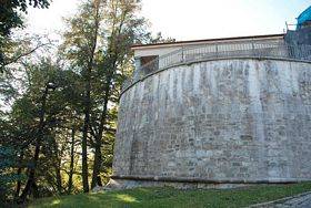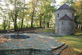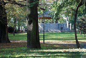 - Zu den Naturdenkmälern gehören auch zwei Gemeine Eschen, von denen eine (407cm / 25m) in der Nähe eines Gebäudes wächst, in dem die Touristen-Information und das Büro des Schlesischen Schlosses der Kunst und des Unternehmertums untergebracht sind, und die zweite, eine zweistämmige (240 + 245cm / 23m), die Aussichtsterrasse überragt. Die erste hier erwähnte Esche hatte bis vor kurzem auch zwei Stämme. Der Baum wurde aber kurz hintereinander von einen Blitz getroffen (in den Jahren 1996 und 1997), woraufhin einer der Stämme abstarb und entfernt werden mußte. Andere stattliche Bäume (273cm / 19m) dieser Art wachsen auf dem Abhang zu der Brauerei hin unterhalb des Piastenturmes sowie oberhalb der Stelle, wo sich früher die Remise befand und wo jetzt nur Teile der Mauer übriggeblieben sind (292cm / 21m und 296cm / 21m);vier Wege nach außen führten. Zwischen dem Oberen und dem Unteren Schloß befand sich ein zweiter Garten ebenfalls in ungleichmäßiger Form und mit gleich langen Seiten. Vor dem Gebäude des Unteren Schlosses in der Nähe der heutigen Schloßstraße (ul. Zamkowa) gab es zusätzlich noch zwei Pflanzengruppen. Nach dem Umbau in der Mitte des 19. Jahrhunderts, dessen Entwurf Josef Kornhäusel vorbereitet hatte, entstand oben auf dem Berg ein romantischer Park. Von den alten Bauten auf dem Schloßberg sind bis heute nur die Rundkirche Weges wächst, der vom Eingang bis zu der Rundkirche und zum Piastenturm führt. Die zwei weiteren (201cm / 19m und 189cm / 19m) findet man in der Nähe des Bergfriedes;