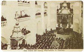 Lange Zeit waren in Schlesien alle anderen Konfessionen als die katholische verboten. Die evangelische Kirche konnte erst nach einer Intervention des schwedischen Königs Karl XII. entstehen. Im Jahre 1707 zwang er Kaiser Josef I. dazu, den Protestanten die beinahe hundertzwanzig Kirchen zurückzugeben und den Bau einiger neuer zu genehmigen. Zwei Jahre später erlaubte also Josef I., vor den Toren der Stadt Teschen die Jesus-Kirche als eine „Gnadenkirche“ zu bauen. Ein Bevollmächtigter des Kaisers kennzeichnete die zu diesem Zwecke gekauften Grundstücke als Baugrundstücke für eine Kirche, indem er eine Stange mit dem Kaiseradler in die Erde einschlug. Zehn Tage später fand der erste nach fünfundfünfzig Jahren öffentliche evangelische Gottesdienst im Teschener Herzogtum statt. An dieser Stelle wurde dann eine kleine Kirche aus Holz gebaut, zu der auch in aller Eile die Altare und die Orgel gestiftet wurden.