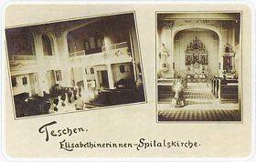 Die Ordensgemeinschaft der Elisabetherinnen vom Dritten Orden des heiligen Franziskus wurde 1622 in Aachen gegründet. Ihr Ziel war die Pflege der Kranken, Alten und Armen. Im Jahre 1736 ließen sich die Elisabetherinnen in Breslau nieder, wo sie unter anderem ein Krankenhaus für Frauen eröffneten. Dort hatte die aus Teschen stammende Witwe Maria Frank mit ihrer Tochter Xaveria das Wirken der Ordensgemeinschaft kennengelernt. Xaveria wurde später selbst Ordensschwester und Maria Frank beschloß, in Teschen ebenfalls ein Frauenkrankenhaus sowie ein Kloster einzurichten. Im Jahre 1753 hatte der Breslauer Bischof dazu seine Erlaubnis gegeben. Dank der Geldmittel aus verschiedenen Stiftungen gelang es den Ordensschwestern, das am Marktplatz gelegene Stadthaus mit Garten vom Grafen Wilczek zu erwerben. Eines der größeren Zimmer hatte man in eine Kapelle der Schmerzensreichen Mutter Gottes umgewandelt. Die Einweihung der Kapelle fand am 16. Juli 1754 statt. Noch im gleichen Jahr konnte auch ein hinter dem Kloster angelegte Friedhof eingeweiht werden. Magdalena Glenk wurde zu der ersten Oberin des neuen Klosters. Im Jahre 1761 konnte ein benachbartes Stadthaus dazugekauft und dann damit begonnen werden, ein Gebäude des Frauenkrankenhauses zu errichten. Gleichzeitig hatte man die Kapelle vergrößert. Sie wurde im Jahre 1773 eingeweiht, und erhielt dann den Namen St.-Joseph-Kapelle. Das Kloster und das Krankenhaus der Elisabetherinnen waren im Jahre 1789 bis auf die Grundmauer abgebrannt. Die Ordensschwester mußten danach vorläufig in das kleine Schloß in Blogotitz (Błogocice) umziehen, konnten aber bereits in den Jahren 1791–1793 die Kloster- und Krankenhausanlage wiederaufbauen. In den neuen Räumlichkeiten wurden dann elf Ordensschwestern und dreizehn Kranke untergebracht. Obwohl der Orden ständig mit finanziellen Schwierigkeiten zu kämpfen hatte, konnte im Krankenhaus während des ganzen 19. Jahrhunderts immer ein gutes Dutzend Personen betreut werden. Die Kosten der Betreuung von Kranken aus Teschen übernahm zum Teil die Stadtverwaltung. Im Jahre 1850 gründeten die Elisabetherinnen eine Filialkirche und ein Krankenhaus in Jablunkau (Jablunkov). Die Jablunkauer Einrichtung war schon dreizehn Jahre später selbständig und von dem Mutterkloster unabhängig geworden.