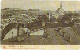 A panorama of the south-east part of town visible from the tower of city-hall; the roofs of tenement-houses near Silver street and Larishs' Palace (nowadays Museum) are in the uppermost. On the left side, near Priest Prutek street, under the evangelical church, there is the back facade of the higher state grammar school (nowadays the Technical Engineering-Electric School), further on, on the right side, the barracks buildings.