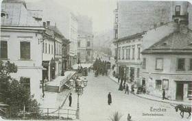 Arch. Stephana street, which had been from the Middle Ages the main trade street of town, seen from the Huntman's Palace. The former name - Deep street was due to the fact that the pavements were raised on each side of the street. The traditional name has been replaced by several new names over the years including a Polish name, Arch. Stephana street, Arch. Charles Francis Joseph and Legion and Red Army street.