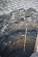 Half a year later, in April 1998, excavations took place on the eastern and northern sides of the market square to change the water pipe system. Thanks to this work, vertical sections of strata to a depth of 1.7 metres were obtained. Archaeological analysis revealed that a layer of paving existed along the entire length of the excavation. This was made of irregularly shaped stones, and was directly below the contemporary pavement of the market square. This earlier pavement was probably constructed in late 18th or early 19th century, after the great fire of 1798. Beneath the paving was a layer of bedding consisting of sand with an admixture of brick rubble and lime mortar. By far the most important layer turned out to be that at a depth of 0.7 to 0.9 m below the present ground level. A regular, vertical layer was discovered, composed of river-smoothed cobbles – this was almost certainly the remains of the original paving of the market square built in 1496. No further layers of stone paving were confirmed below this level, although there was another, extremely interesting, dark grey layer of earth containing a large amount of chippings and wood slivers. These were probably the remains of everyday life from before the cobbles were laid at the end of the 15th century on the newly created market square. The existence of this layer is explained by the fact that towards the end of the 15th century the present market square was the site of a market, situated then by the eastern defensive walls of the town.