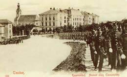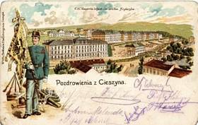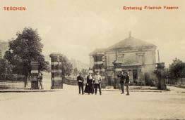 The former barracks, erected in 1895 and named after Archduke Friedrich Habsburg, the Cieszyn Duke of those days and, at the same time, one of the main commanders of the Austro-Hungarian army, comprised 22 structures situated on the slopes of Mały Jaworowy Hill shelving down towards the Olza valley. This impressive complex of buildings replaced the modest barracks that had been situated, to the end of the 18th century, at the location of today’s theatre. That made it possible to place in Cieszyn the following: the 100th infantry regiment named after Duke Starhemberg, the 3rd infantry regiment named after Archduke Charles, the 31st regiment of national defence ‘Teschen’ (Cieszyn), auxiliary services, a recruitment office, a gendarmerie, a hospital and an orchestra. The first and the most important building was the Headquarters. Next to the headquarters there was a guardhouse (today’s Police-Station) and behind them - three battalion headquarters built along the drill-ground lined with chestnut-trees. The remaining buildings are situated on ul. Gen. W. Sikorskiego (General Władysław Sikorski street). The former barracks of the national defence, where today there is a Complex of Secondary Schools, were situated below, on J.I. Kraszewskiego street.