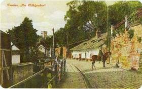 At Mill-Race street (nowadays Przykopa). As early as the Middle Ages there was an artificial water-course between the citizen's walls and the Olza, which rose from Puncówka and tavelled down to Bobrówka. The rapid current of the so-called Mill-Race drove the wheels of the mill (so-called Big Mill), which can be seen on the right. One of the wickets in the town's walls and later a back-street called The Mill's Gate took their name from the mill.