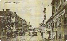Priest Prutek street from the evangelical church. The inn “At the Golden Sun" is on the right side with its Cieszyn tram station. The street was named in honour of the priest Jerzy Prutek, a catechist and a worthy charitable person, who in the latter part of his life fell into disgrace with the Catholic church authorities.