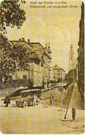 Residential street with a view of the evangelical church. On the left, there is the Pohlner family house, behind, there is a tenement-house with a bay window; an active socialist Tadeusz Reger lived here for many years. In the street - one of the oldest Cieszyn automobiles. The first cars appeared in Cieszyn in 1908, and slowly forced out the omnipresent horse drawn carriages.